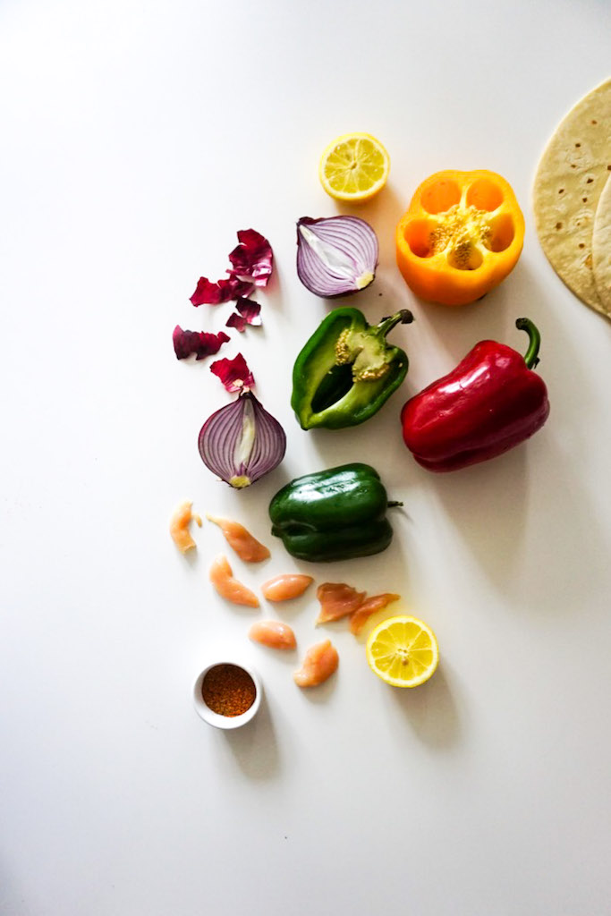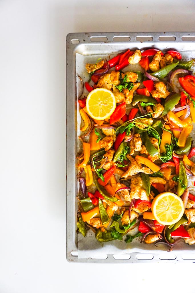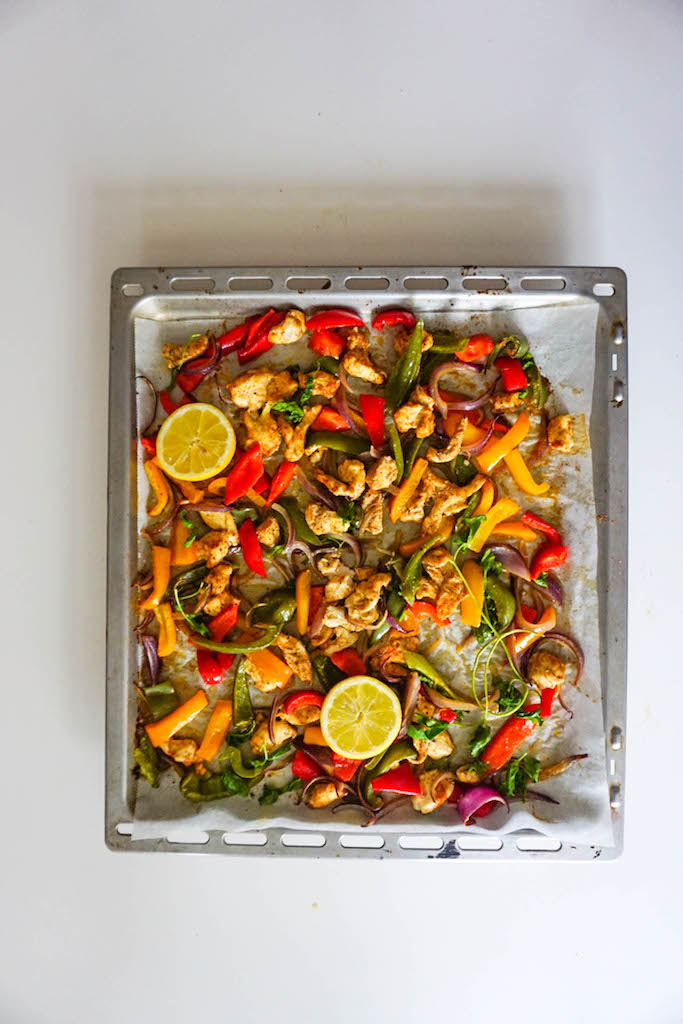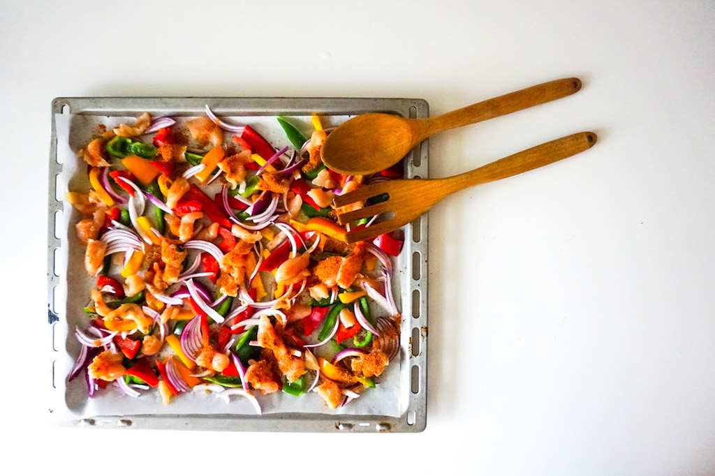 Sve sastojke isecite na režnjeve. Na dno pleha položite papir za pečenje ili ga samo dobro podmažite uljem. Na pek papir položite iseckanu papriku, crni luk, parčiće mesa i sve to posujte belim lukom i mešavinom začina. Prelijte maslinovim uljem i sve dobro promešajte. Stavite da se peče 20 minuta na 200 stepeni.