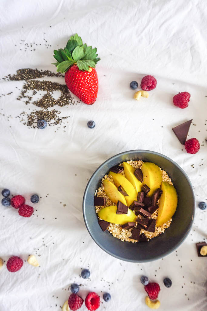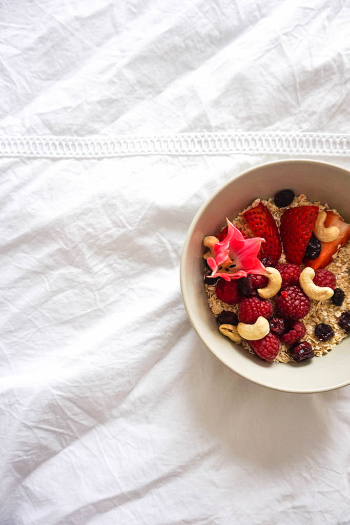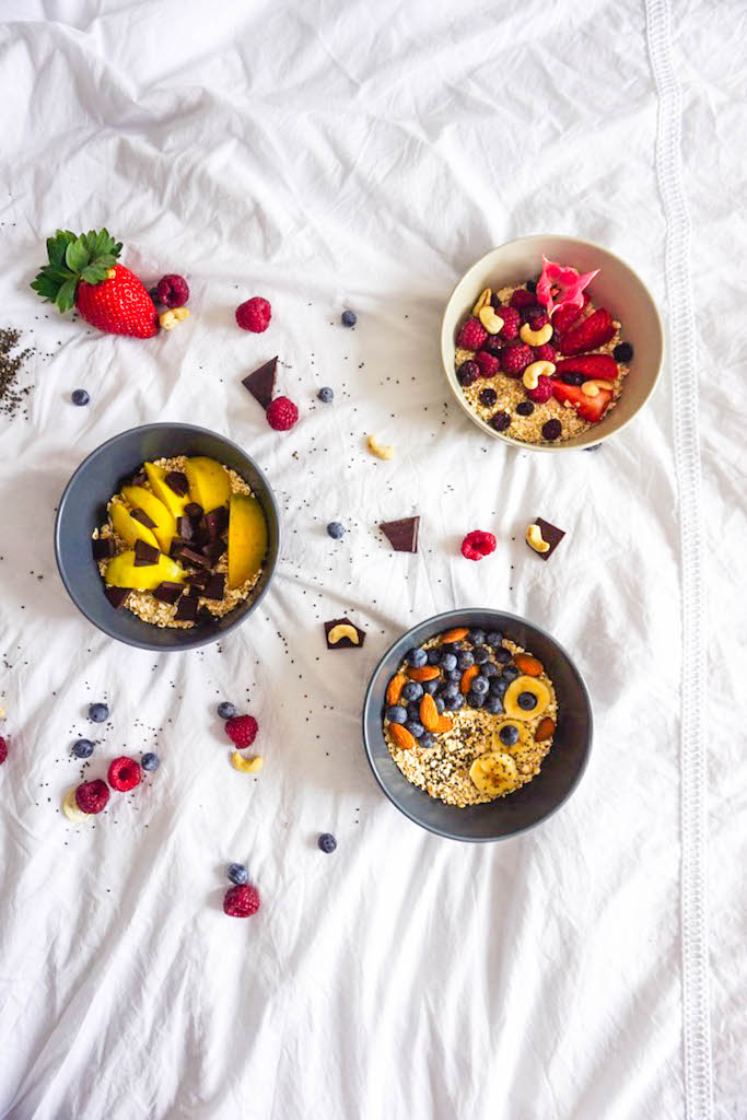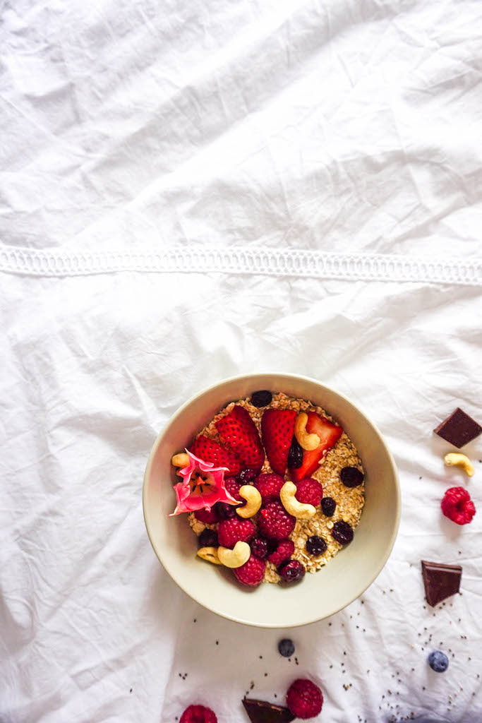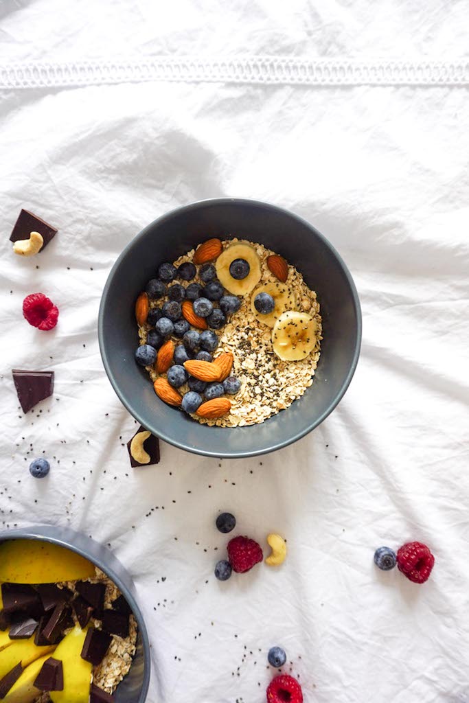 Pomešajte pahuljice, bademovo mleko i vodu, dodajte čija semena, javorov sirup i cimet i pustite da odstoji u frižideru preko noći. Ako vam se ujutru žuri na posao/vrtić/kafu/date sa sobom uzmite plastičnu posudu u kojoj vas čeka već pripremljene i mekane pahuljice, prelijte ih sa malo vruće vode (da ih ne jedete hladne) i dodajte sveže voće, bademe, indijski orah, brusnice te prelijte nekim (voćnim) jogurtom – po želji, pahuljice su ukusne i bez toga.