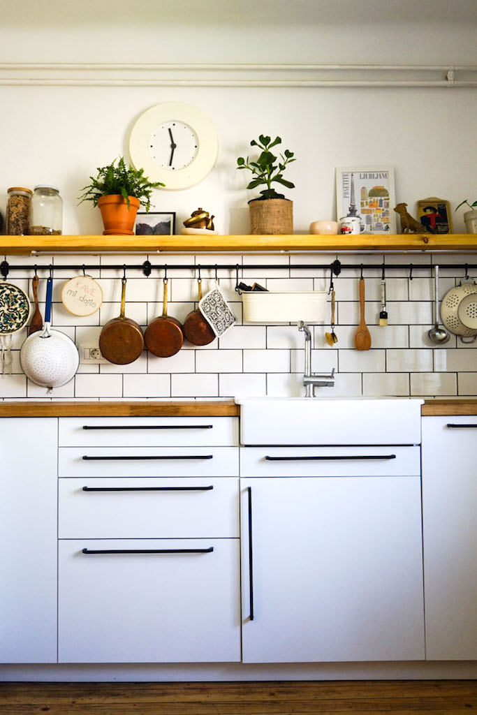 Umesto nove, shiny kuhinje kupili su takvu koja pristaje gospođi u godinama kakva je njihova zgrada i ostalim prostorijama u stanu. I pronašli su je u Ikei. Još jedan DIY i puf, eto im polica za sve kuhinjske drangulije.